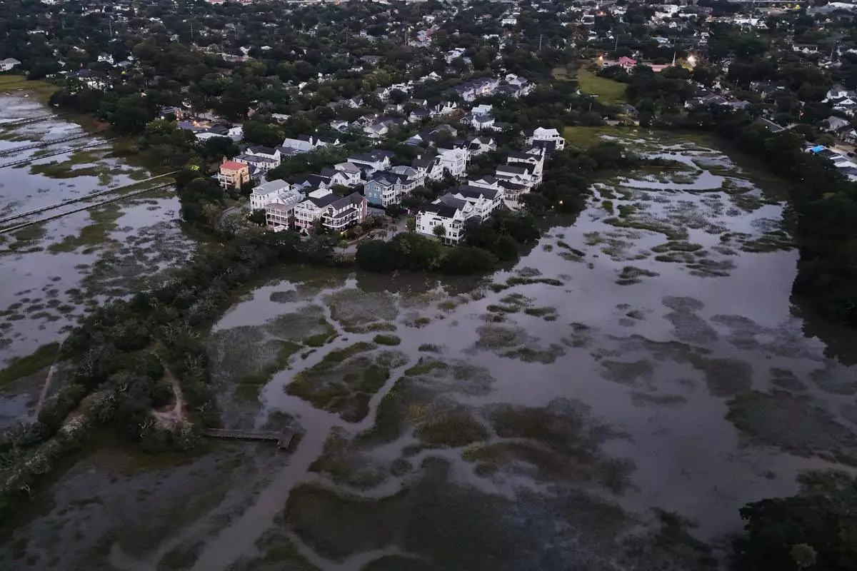 Houses sit next to a salt marsh at high tide, Monday, Oct. 6, 2025, in Charleston, S.C. (AP Photo/Joshua A. Bickel)