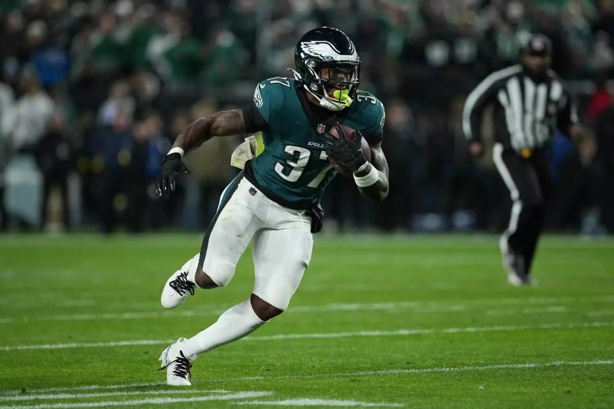 Philadelphia Eagles running back Tank Bigsby (37) runs with the ball during the first half of an NFL football game against the Detroit Lions on Sunday, Nov. 16, 2025, in Philadelphia. (AP Photo/Matt Slocum)
