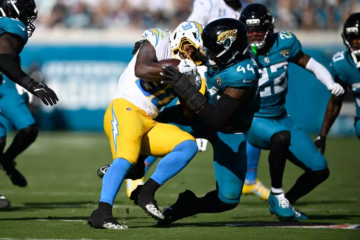 Los Angeles Chargers running back Kimani Vidal (30) is tackled by Jacksonville Jaguars defensive end Travon Walker (44) during the first half of an NFL football game, Sunday, Nov. 16, 2025, in Jacksonville, Fla. (AP Photo/Phelan M. Ebenhack)
