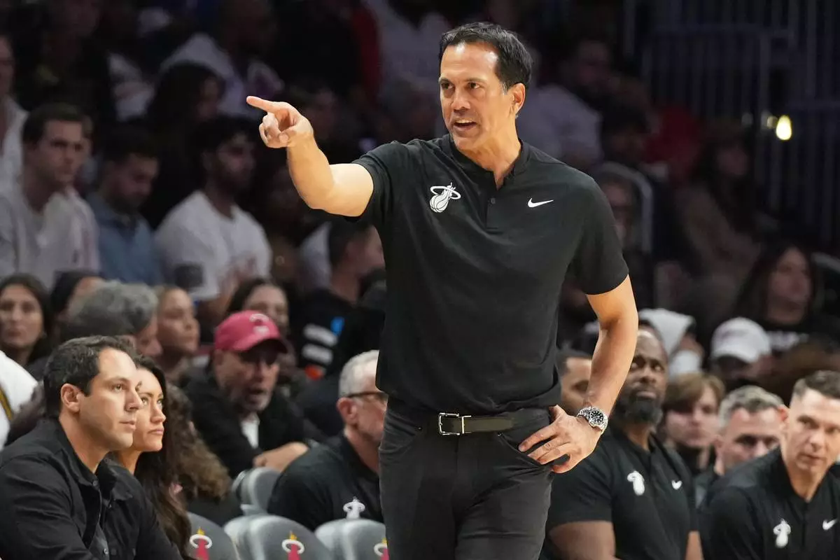 Miami Heat head coach Erik Spoelstra gestures during the second half of an NBA basketball game against the Cleveland Cavaliers Monday, Nov. 10, 2025, in Miami. (AP Photo/Marta Lavandier)