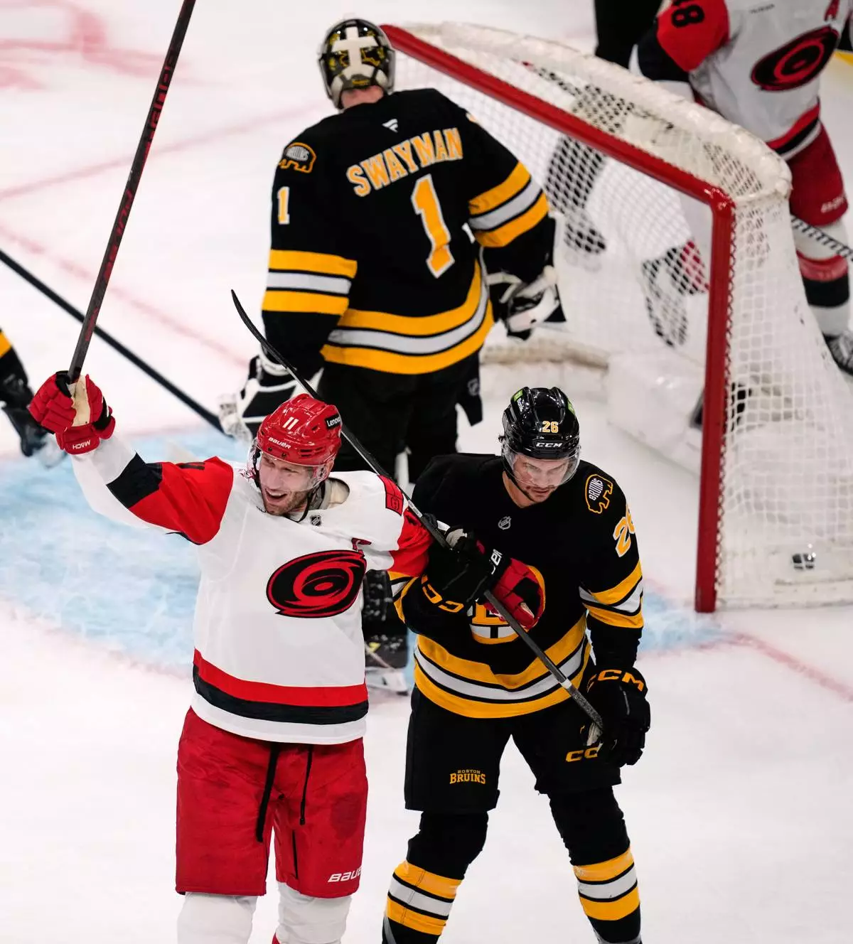 Swayman made a glove stop on Seth Jarvis’ clean breakaway with the Hurricanes’ shorthanded late in the second.