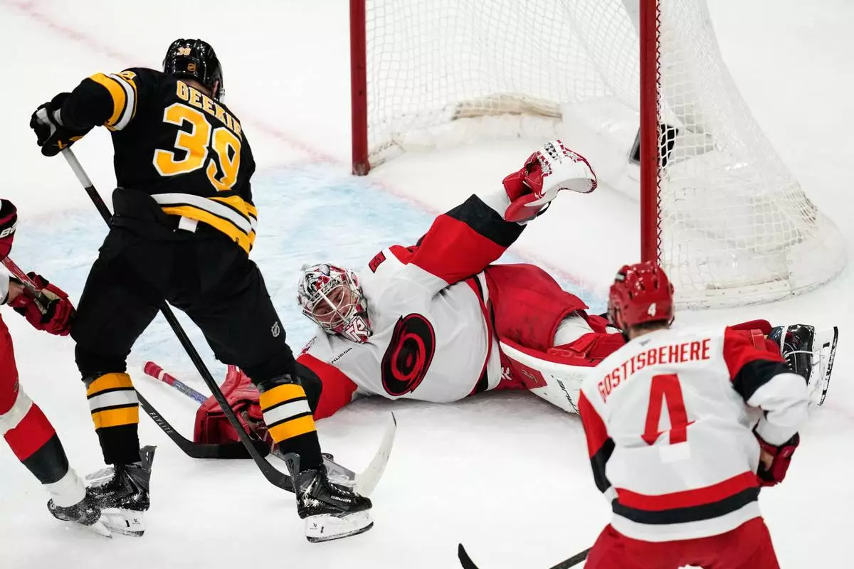 BOSTON (AP) — Jordan Staal outmuscled a Boston defenseman for a goal with one arm, Pyotr Kochetkov stopped 29 shots and the Carolina Hurricanes cooled off the hot Bruins for a 3-1 victory on Monday night.