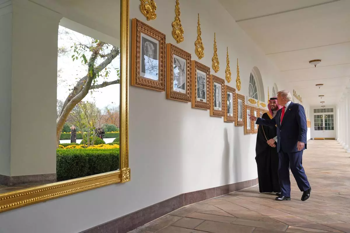 President Donald Trump walks with Saudi Arabia's Crown Prince Mohammed bin Salman along the colonnade, at the White House, Tuesday, Nov. 18, 2025, in Washington. (AP Photo/Alex Brandon)