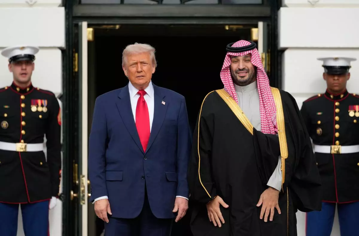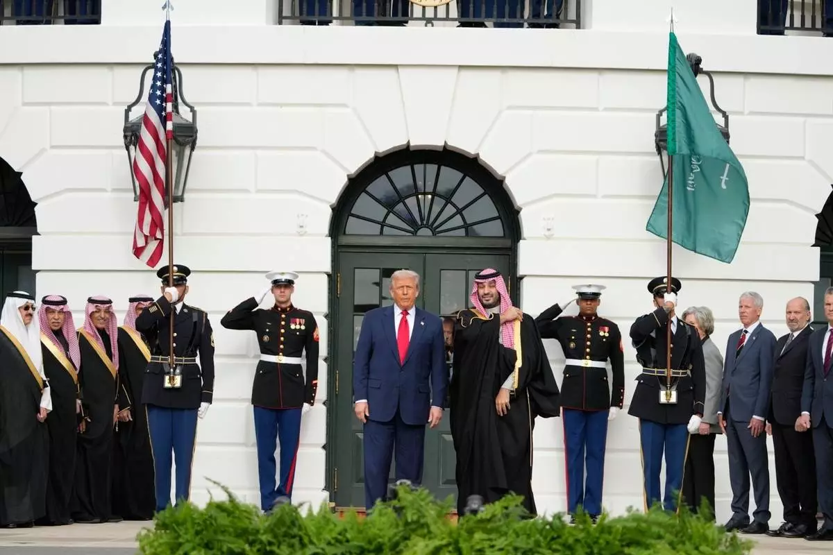 Trump warmly received Prince Mohammed when he arrived at the White House Tuesday morning for a pomp-filled arrival ceremony that included a military flyover and a thundering greeting from the U.S. Marine band.