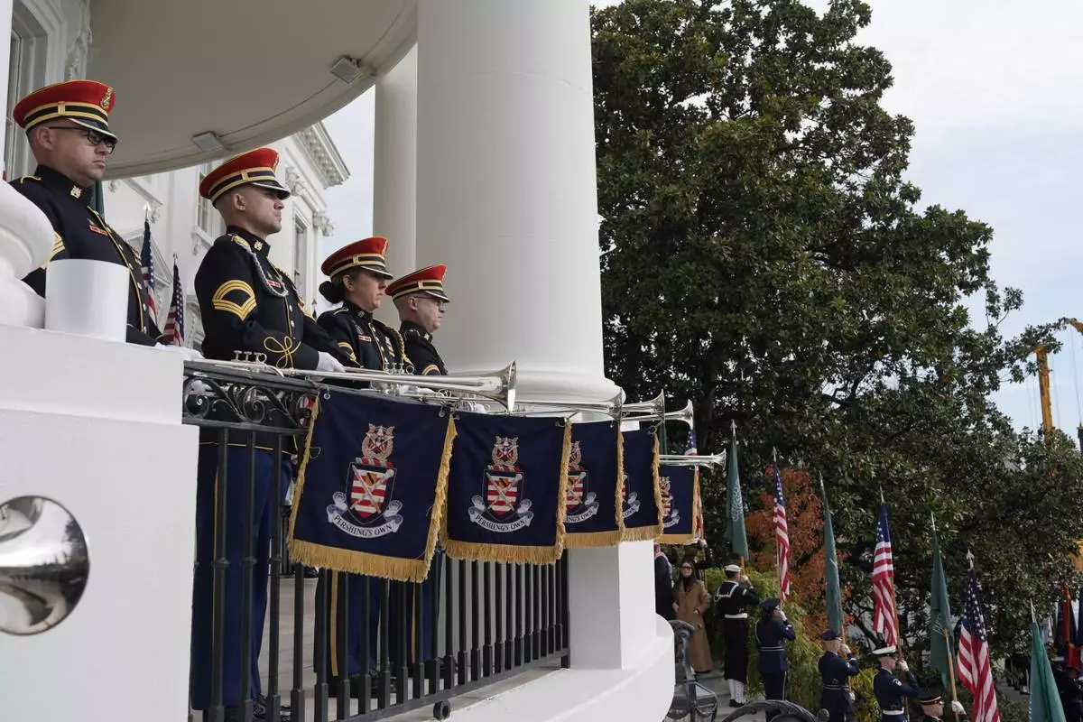 Members of the United States Army Band Herald Trumpets stand ready for President Donald Trump to welcome Saudi Arabia's Crown Prince Mohammed bin Salman to the White House, Tuesday, Nov. 18, 2025, in Washington. (AP Photo/Alex Brandon)