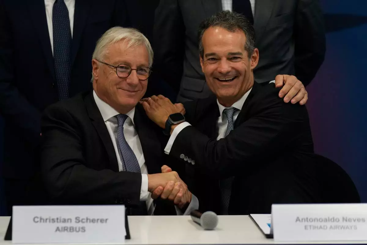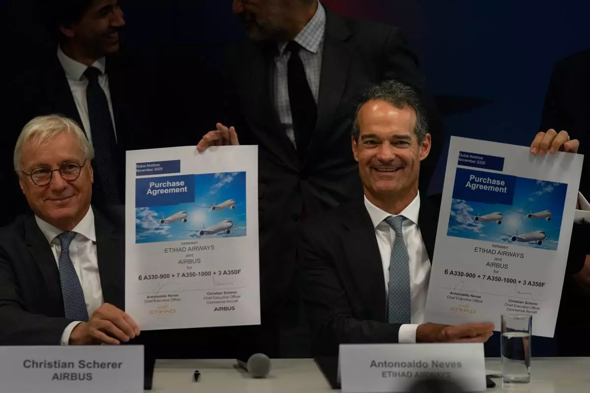 Airbus' CEO of commercial aircraft Christian Scherer, left and Etihad Airways CEO Antonoaldo Neves show purchase agreement at a press conference after announcing a deal to purchase 16 Airbus planes at the Dubai Air Show, United Arab Emirates, Tuesday, Nov. 18, 2025. (AP Photo/Altaf Qadri)