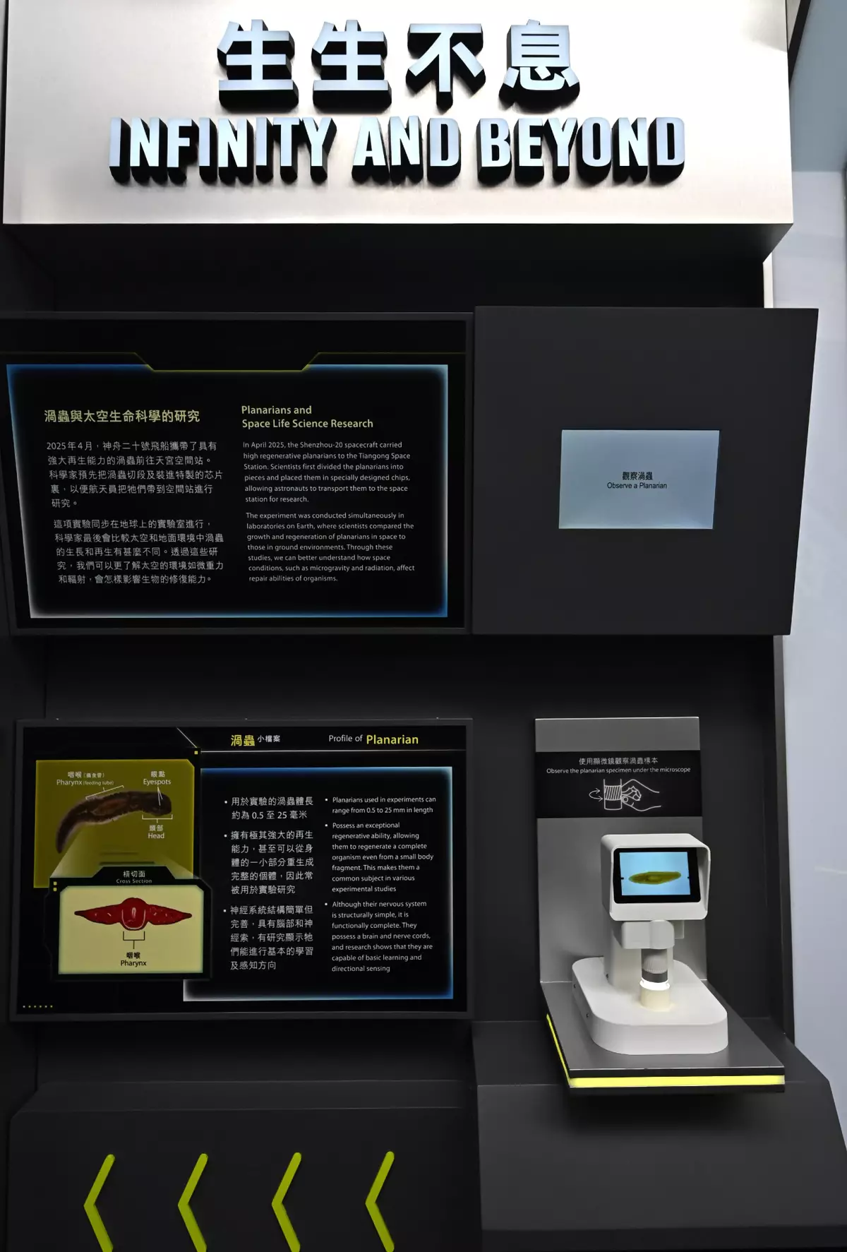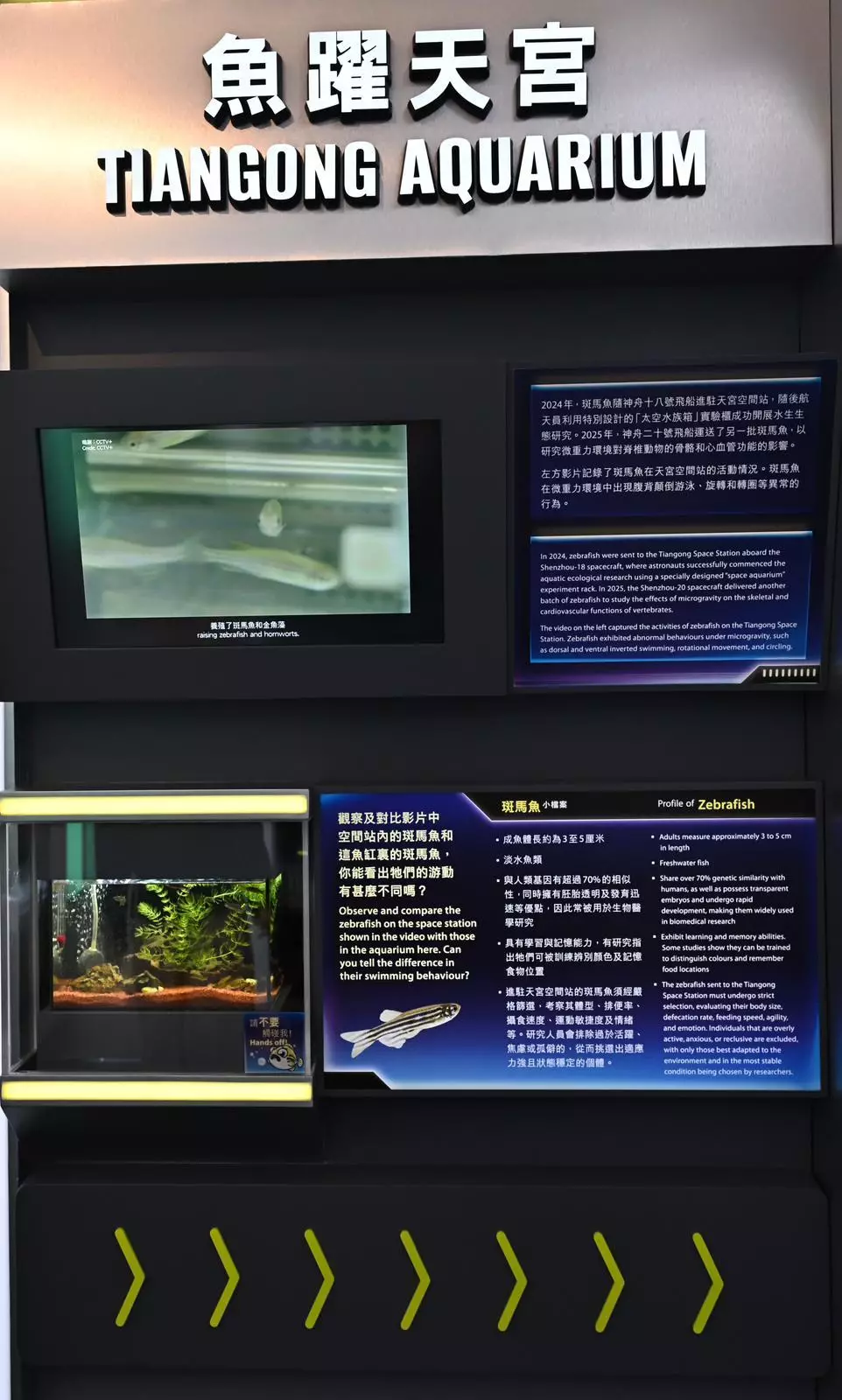 The exhibition also introduces diverse scientific experiments conducted by astronauts in the weightless environment on the space station. Visitors can examine a planarian specimen through a microscope to gain insights into experiments on planarian regenerative ability conducted aboard the space station. Visitors can also observe zebrafish in the exhibition's aquarium to compare the behavioural differences with those raised on the space station. The "Horticulture in Tiangong" area showcases how scientists overcome the challenges of cultivating plants on the space station and features a small planter where visitors can identify different types of vegetables and fruits previously grown aboard the space station. These research findings not only drive current technological progress but also lay the scientific foundation for humanity's future life in space.