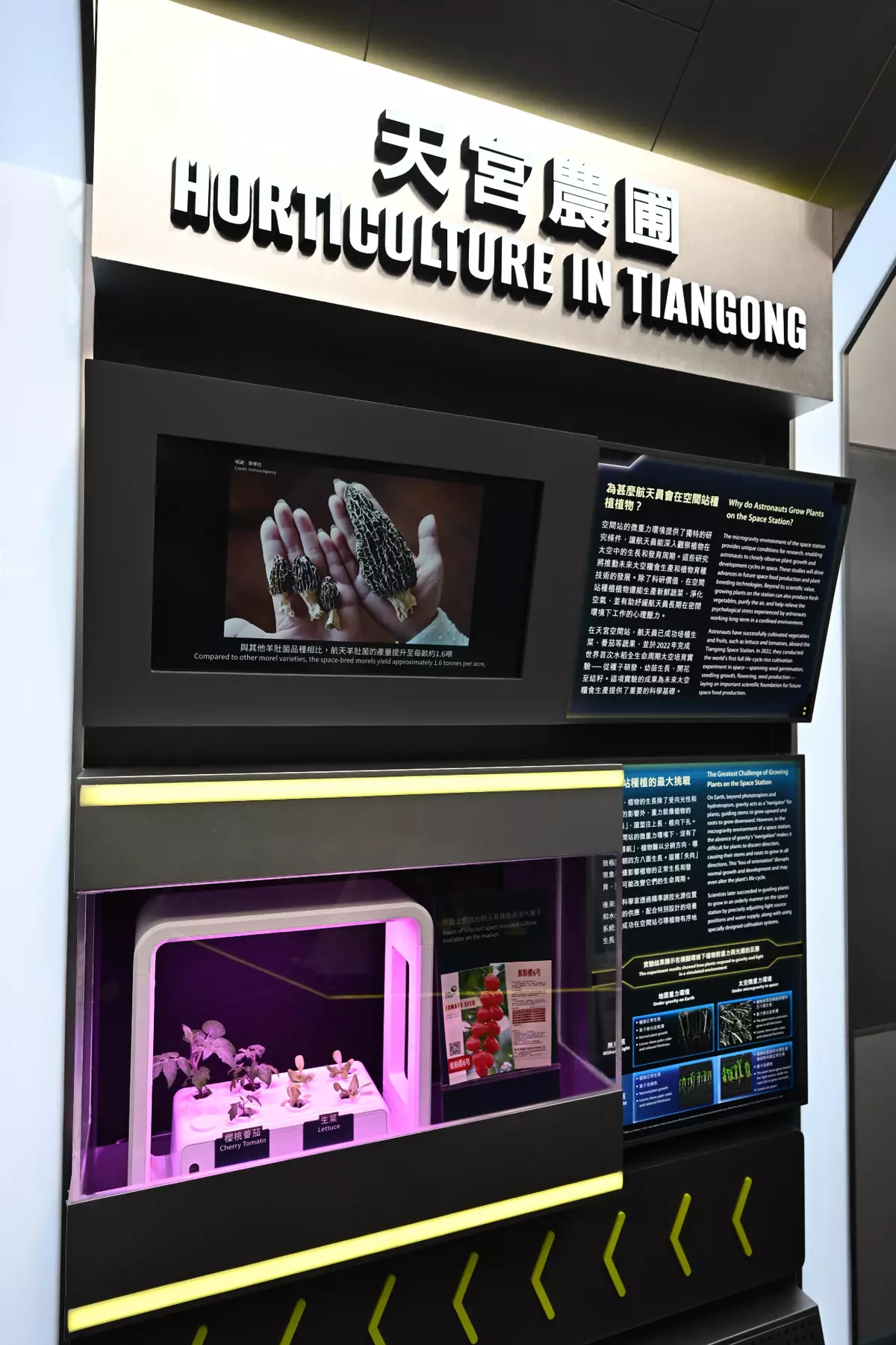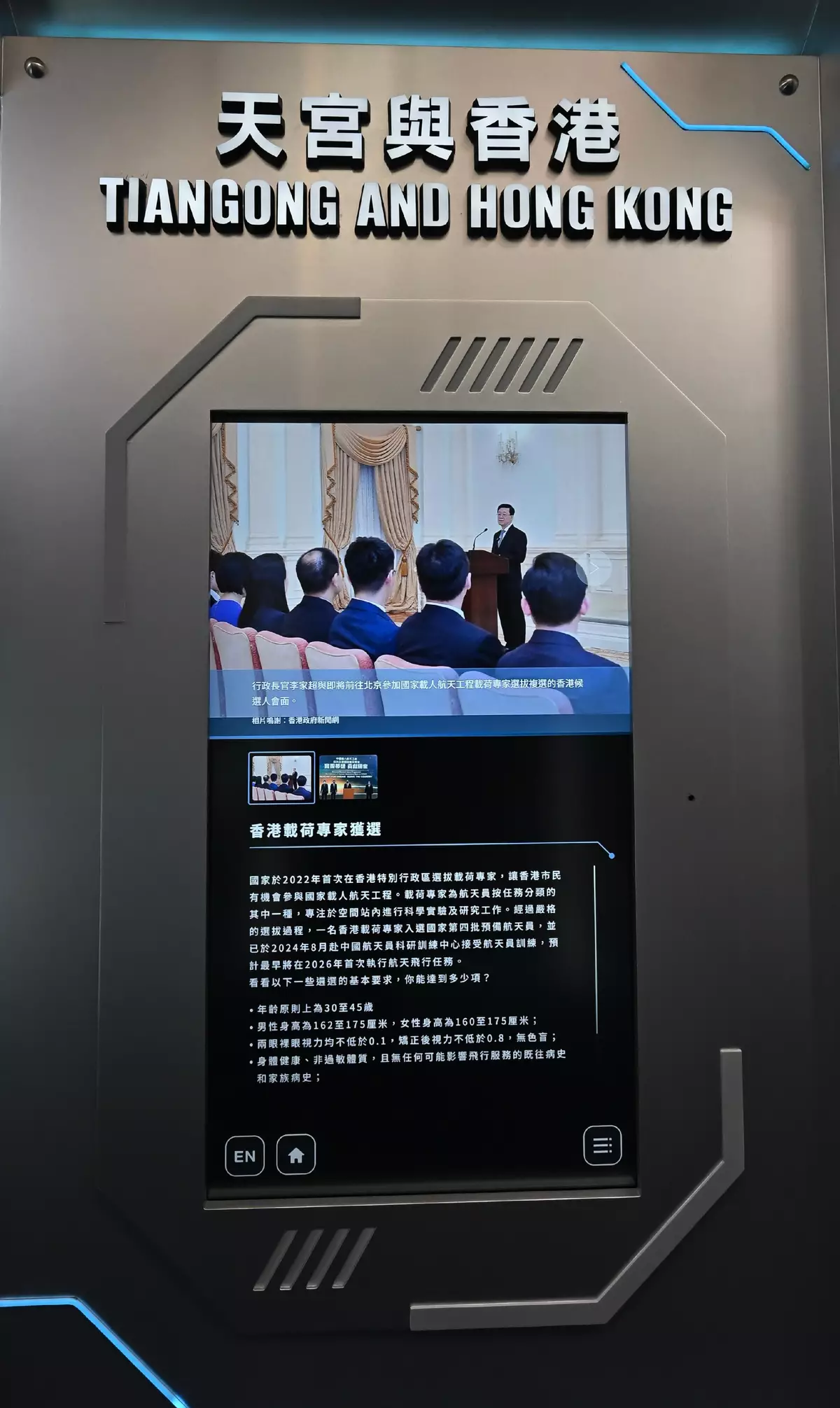 Lastly, the exhibition outlines Hong Kong's participation in Tiangong Space Station experiments and educational programmes, including a local university's agricultural research project launched into space, as well as the selection of Hong Kong's first payload specialist for the country's fourth batch of preparatory astronauts.