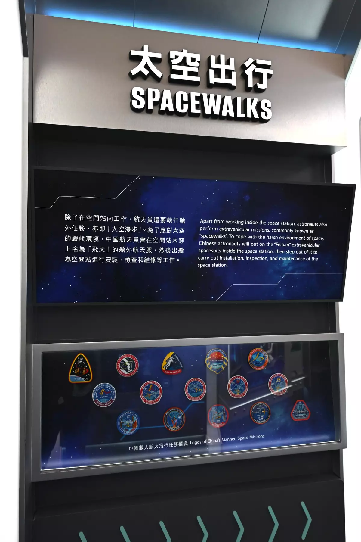 The Tiangong Space Station is a "Space Home" constructed independently by China. It operates in low Earth orbit approximately 400 kilometres above the Earth's surface. The HKSpM transformed the exhibition area at the foyer into a "space station". Highlighted exhibits include a Tiangong Space Station model that illustrates the functions of its various modules, and a replica of the second-generation "Feitian" EV spacesuit that introduces visitors to how the EV spacesuit ensures astronauts' safety while working in the harsh conditions of space. Visitors can also engage in the interactive game "Team Up! The Space Crew" to discover which roles they might fit in within the manned space programmes, learning about the work of astronauts and ground support personnel.