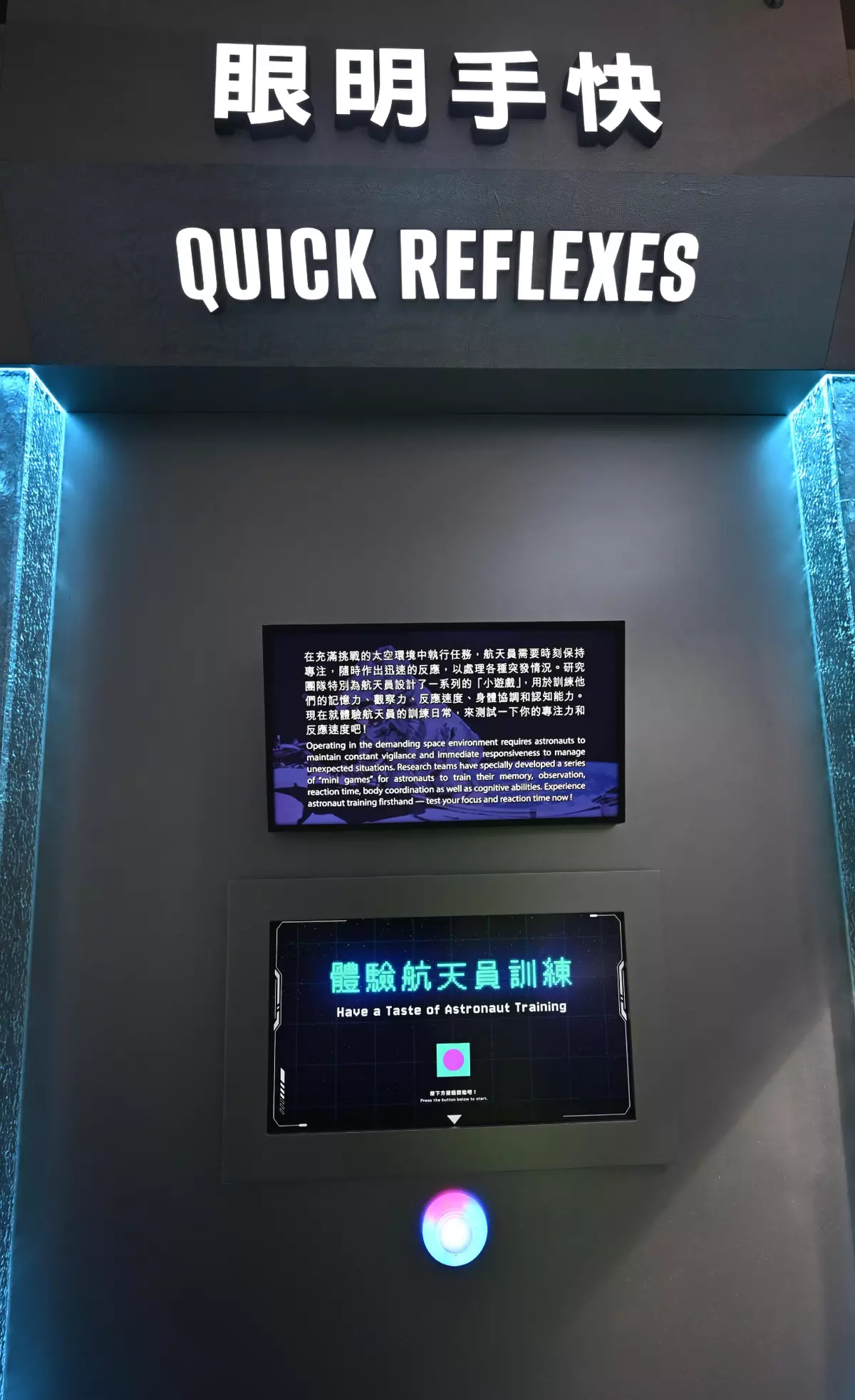 Astronauts have to undergo over 200 specialised training programmes. The exhibition shows video clips of astronauts conducting underwater training. They practise working in a simulated weightless environment in a neutral buoyancy pool housing a full-scale spacecraft model while wearing underwater training suits that resemble EV spacesuits. Visitors can also experience the concentration and reaction training of astronauts through an interactive game.