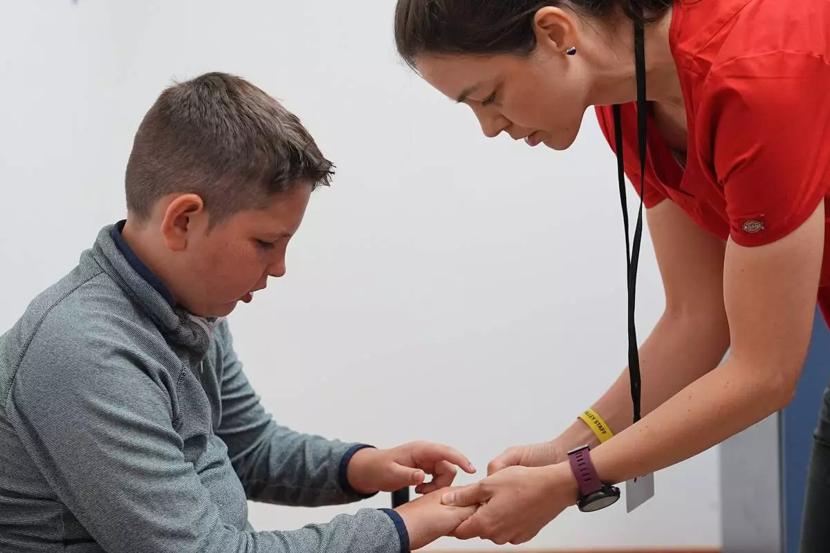 Dr. Natalia Vasquez-Canizares, right, examines Ethan Blanchfield-Killeen, 11, of Yonkers, N.Y., who has a form of juvenile idiopathic arthritis, at the Frost Valley YMCA sleepaway camp in Claryville, N.Y., Thursday, July 31, 2025. The camp partnered with Children's Hospital at Montefiore so kids with autoimmune diseases could attend for the first time. (AP Photo/Matt Rourke)