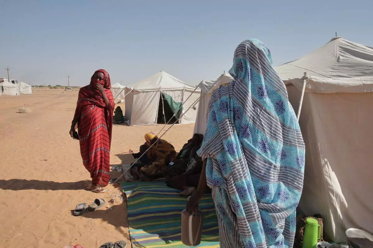 Nadra Mohamed Ahmed, left, stands outside her tent at the newly established El-Afadh camp in Al Dabbah, Sudan's northern state, Monday, Nov. 17, 2025. (AP Photo/Marwan Ali)