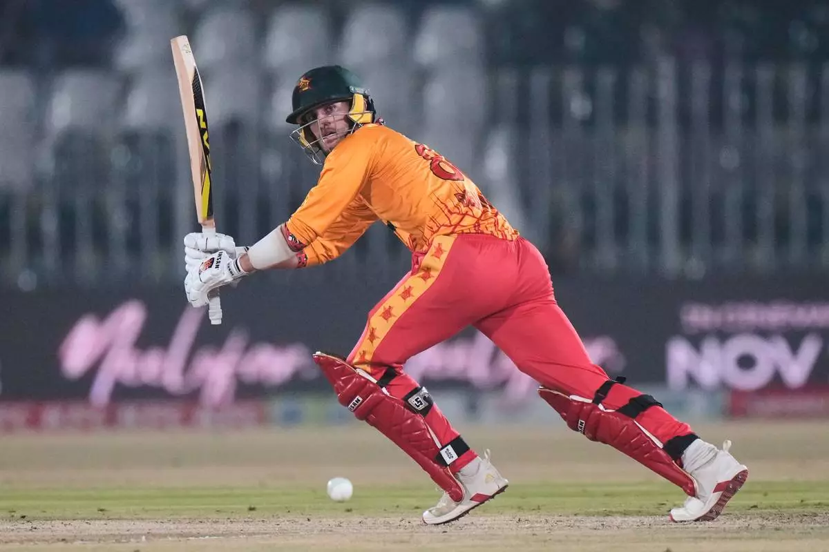 Zimbabwe's Brian Bennett plays a shot during the tri-series T20 cricket match between Pakistan and Zimbabwe, in Rawalpindi, Pakistan, Tuesday, Nov. 18, 2025. (AP Photo/Anjum Naveed)