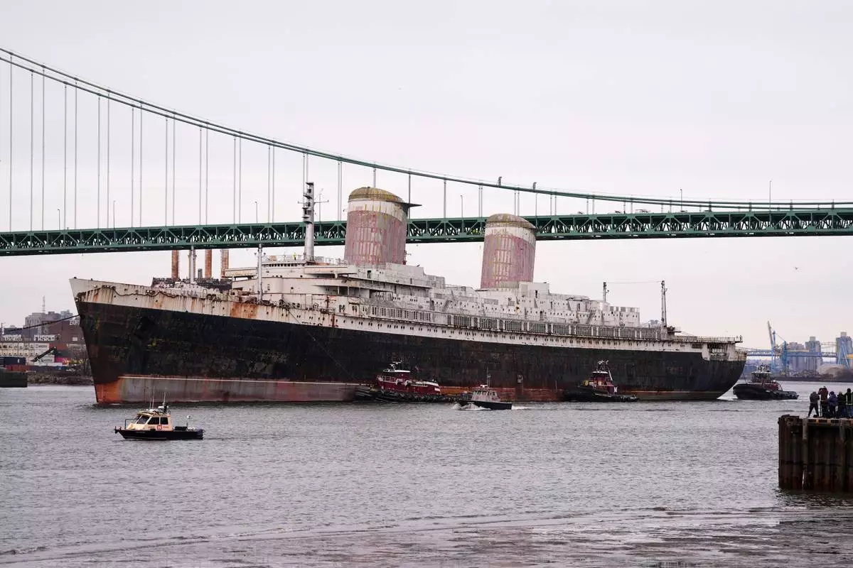 FILE - The SS United States is towed down the Delaware River between Pennsylvania and New Jersey, from Philadelphia, Wednesday, Feb. 19, 2025. (AP Photo/Matt Rourke, File)