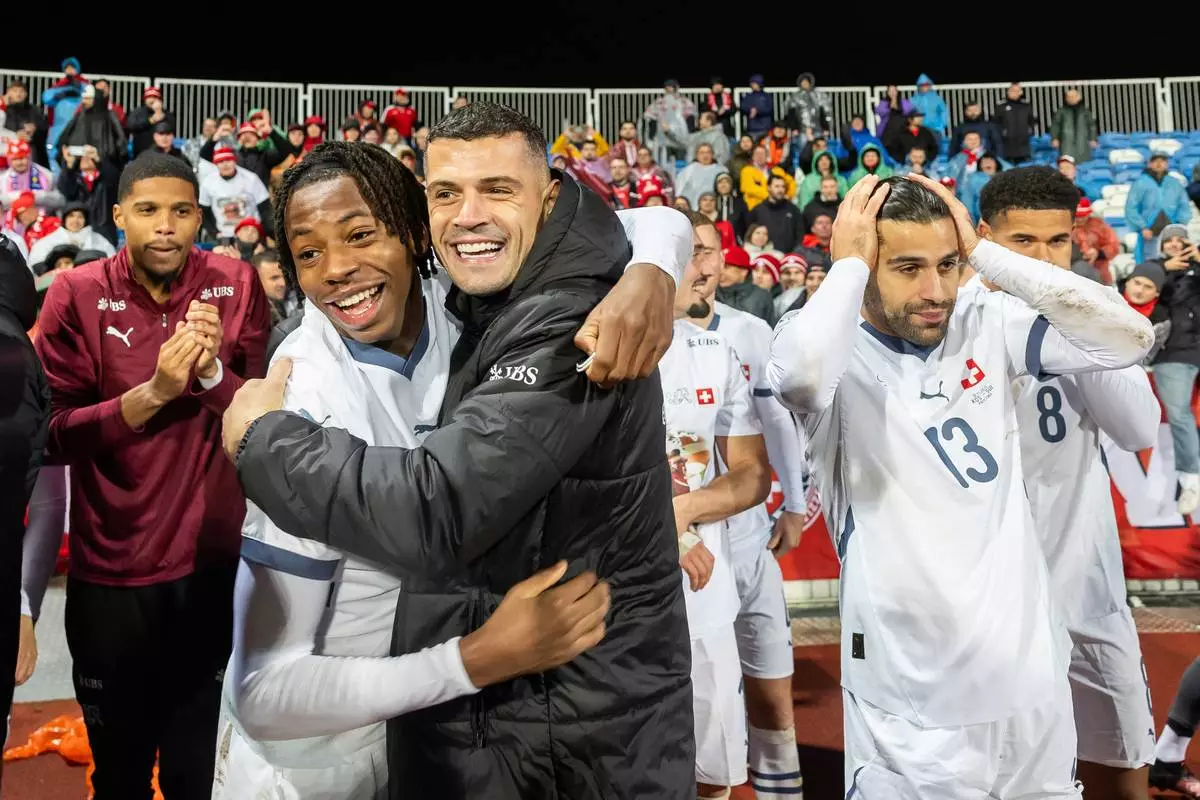 Switzerland's, from left, Johan Manzambi, Granit Xhaka and Ricardo Rodriguez, celebrates with teammates after the 2026 World Cup Group B qualifying soccer match between Kosovo and Switzerland in Pristina, Kosovo, Tuesday, Nov. 18, 2025. (Salvatore Di Nolfi/Keystone via AP)
