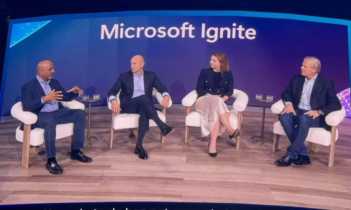 Kore.ai CEO Raj Koneru (L) in conversation with Nick Parker, Microsoft Chief Business Officer and President of Worldwide Sales & Solutions (R) at Microsoft Ignite