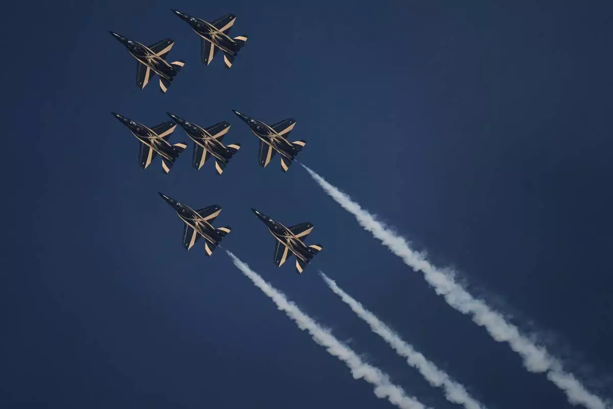 Fursan Al Emarat, the aerobatics demonstration team of the United Arab Emirates Air Force, performs during the Dubai Air Show in Dubai, United Arab Emirates, Tuesday, Nov. 18, 2025. (AP Photo/Fatima Shbair)