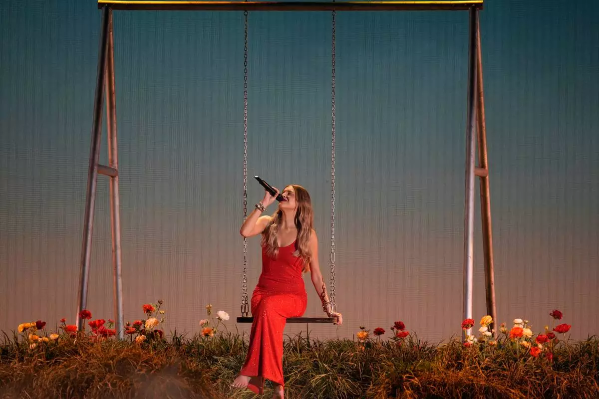 Kelsea Ballerini performs "I Sit In Parks" during the 59th Annual Country Music Association Awards on Wednesday, Nov. 19, 2025, at Bridgestone Arena in Nashville, Tenn. (AP Photo/George Walker IV)