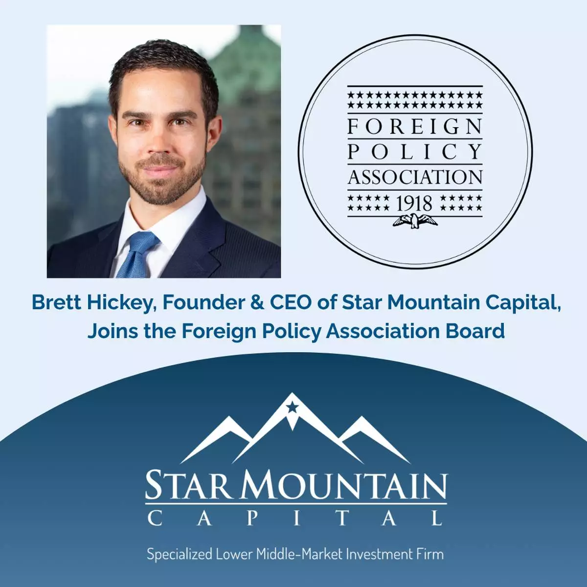 Star Mountain Capital, LLC ("Star Mountain"), a specialized private investment firm focused on delivering systematic alpha and low market-correlated, tax-advantaged returns from the inefficient lower middle-market, is pleased to announce that its Founder & CEO, Brett Hickey, has joined the Foreign Policy Association (FPA) Board of Directors.