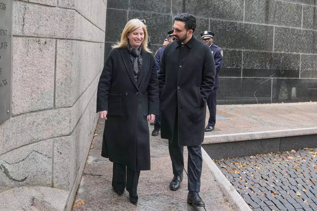 New York Mayor-elect Zohran Mamdani and New York City Police Commissioner Jessica Tisch walk to the New York City Police Memorial, Wednesday, Nov. 19, 2025. (AP Photo/Richard Drew)