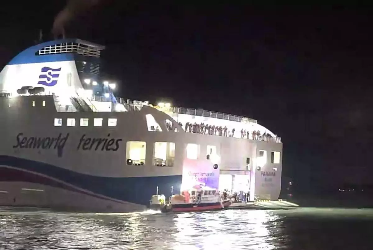 Officers work to assist passengers aboard a South Korean ferry which rans aground on rocks off the southwest coast, South Korea, Wednesday, Nov. 19. 2025. (The Korea Coast Guard/Yonhap via AP)