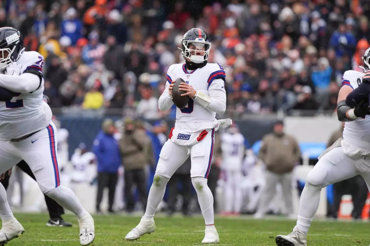 New York Giants quarterback Jaxson Dart, center, looks to throw during the first half of an NFL football game against the Chicago Bears, Sunday, Nov. 9, 2025, in Chicago. (AP Photo/Nam Y. Huh)