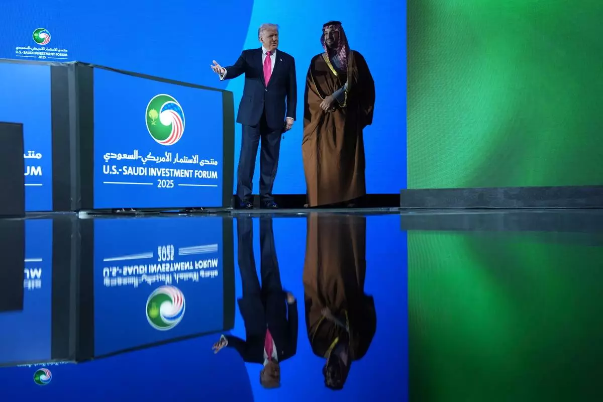 President Donald Trump walks on stage during the Saudi Investment Forum with Saudi Arabia's Crown Prince Mohammed bin Salman at the Kennedy Center, Wednesday, Nov. 19, 2025, in Washington. (AP Photo/Evan Vucci)