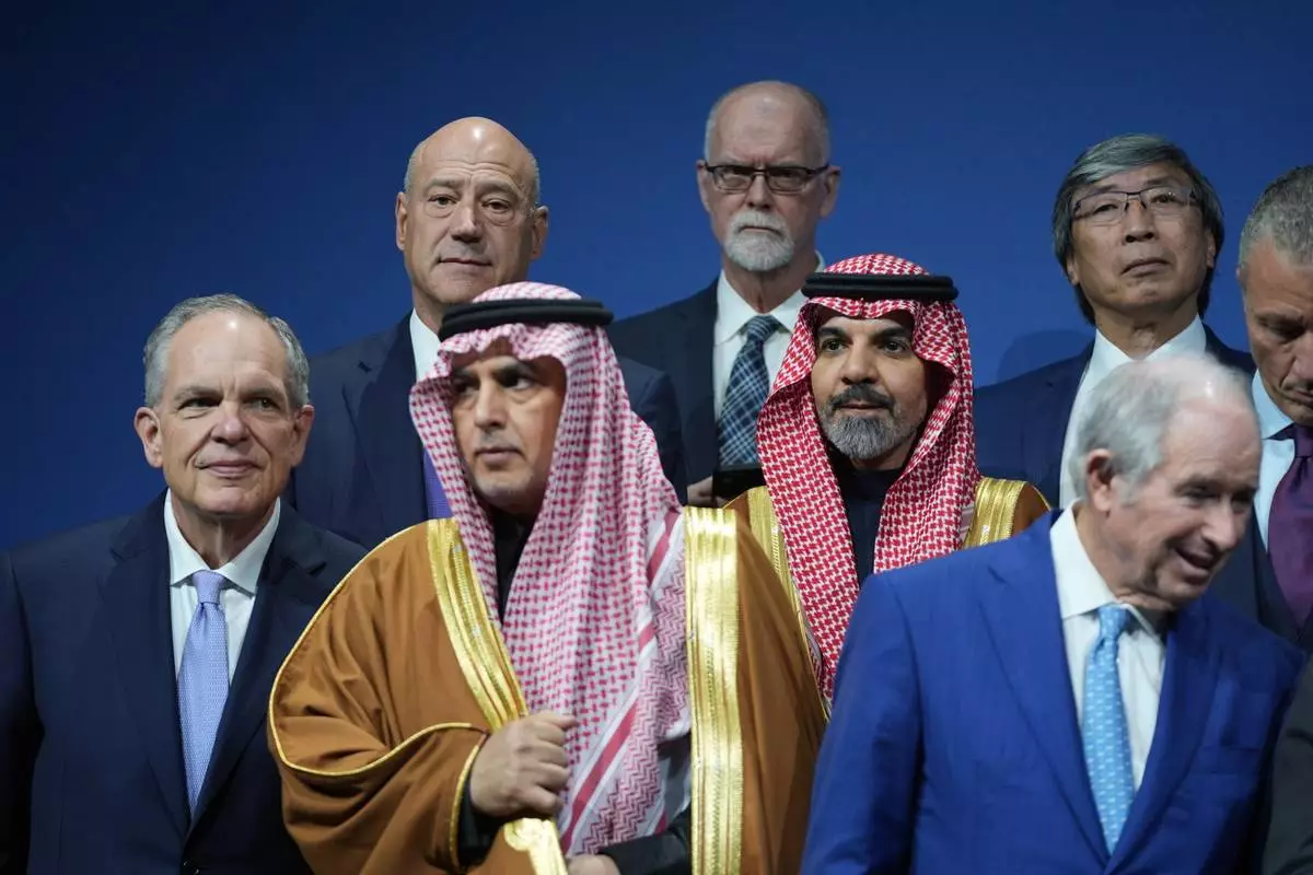 Saudi Investment Forum participants stand together before they are photographed as a group with President Donald Trump and Saudi Arabia's Crown Prince Mohammed bin Salman at the Kennedy Center, Wednesday, Nov. 19, 2025, in Washington. (AP Photo/Evan Vucci)