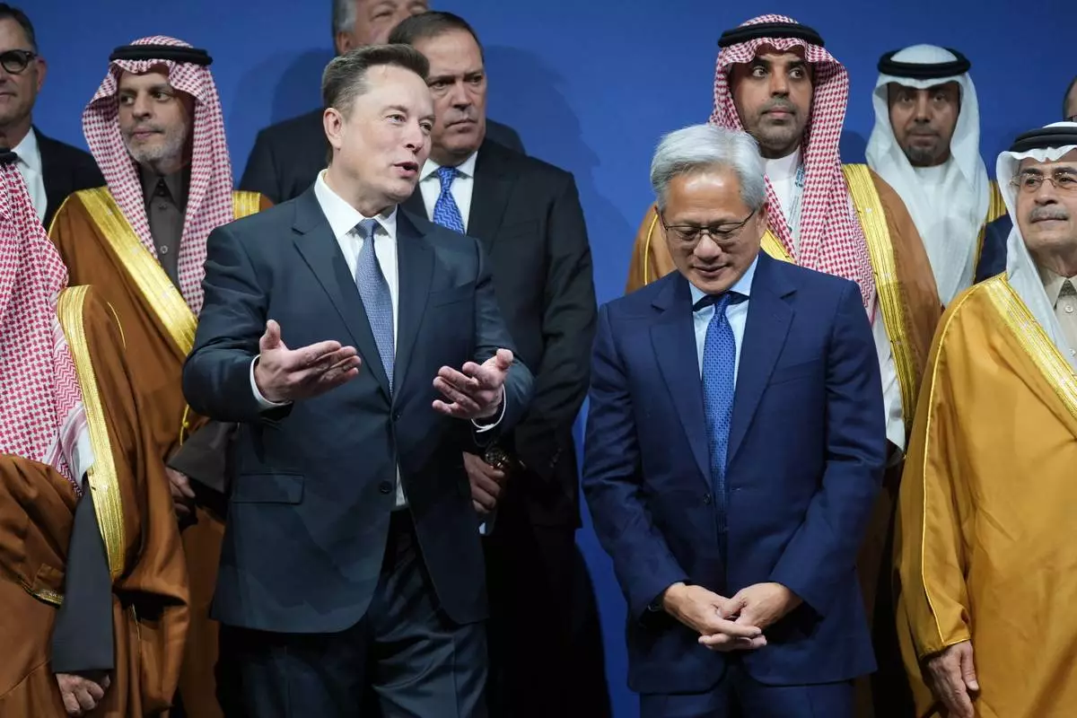 Elon Musk speaks with Nvidia CEO Jensen Huang, as they attend the Saudi Investment Forum at the Kennedy Center, Wednesday, Nov. 19, 2025, in Washington. (AP Photo/Evan Vucci)