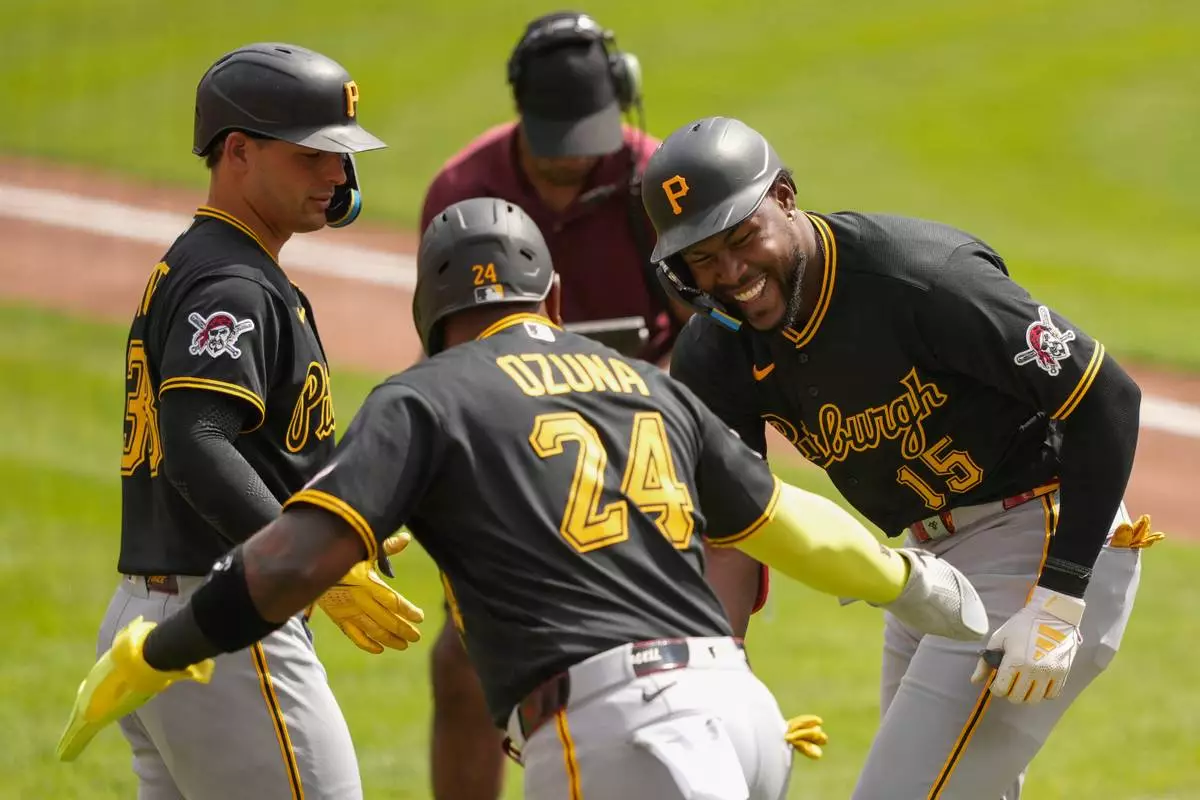 Pittsburgh Pirates' Oneil Cruz, left, Marcell Ozuna, center, and Bryan Reynolds, right, after hitting a three-run homer in the first inning of a baseball game against the Cincinnati Reds in Cincinnati, Wednesday, April 1, 2026. (AP Photo/Carolyn Kaster)