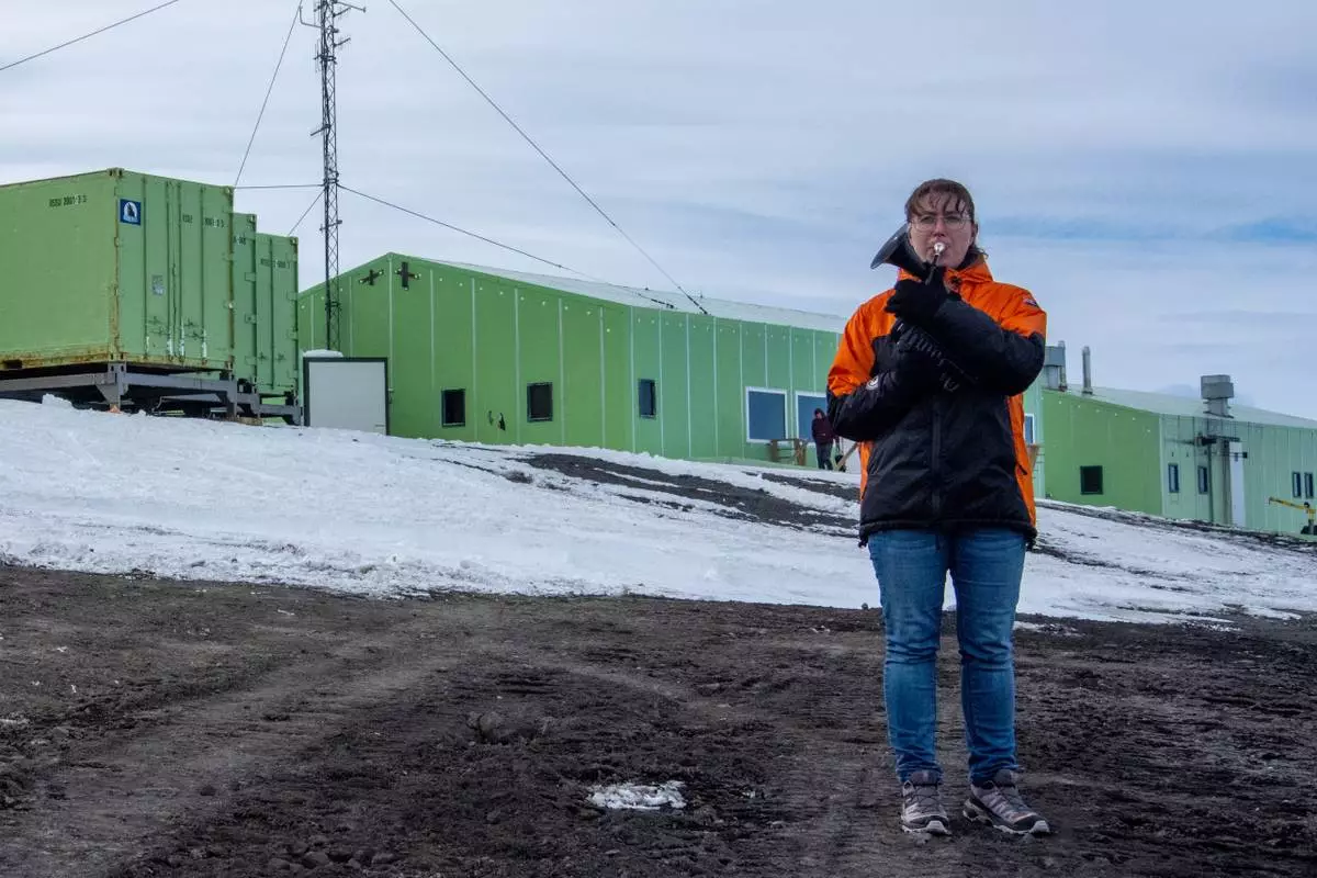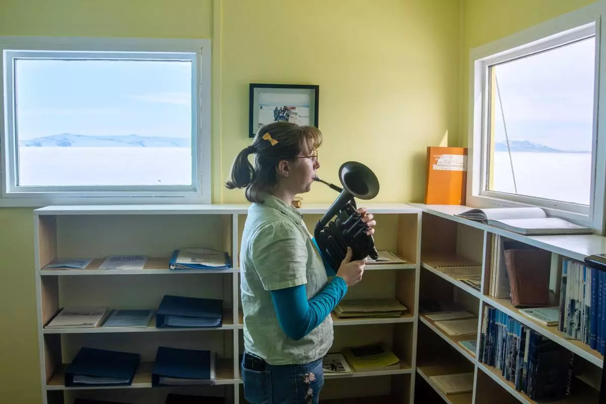 In this photo provided by Antarctica New Zealand, Natalie Paine plays a plastic French horn at Scott Base in Antarctica, on Nov. 16, 2025. (Anthony Powell/Antarctica New Zealand via AP)