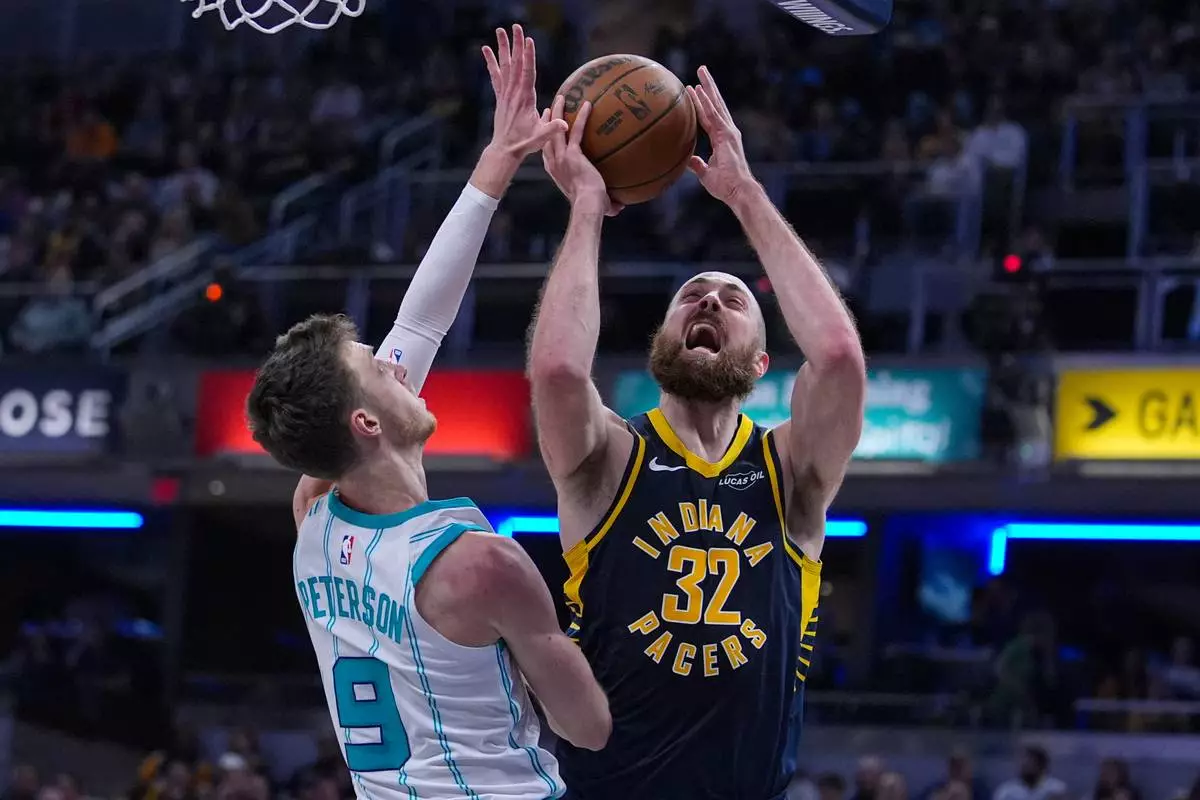 Indiana Pacers center Jay Huff (32) shoots ver Charlotte Hornets forward Drew Peterson (9) during the second half of an NBA basketball game in Indianapolis, Wednesday, Nov. 19, 2025. (AP Photo/Michael Conroy)