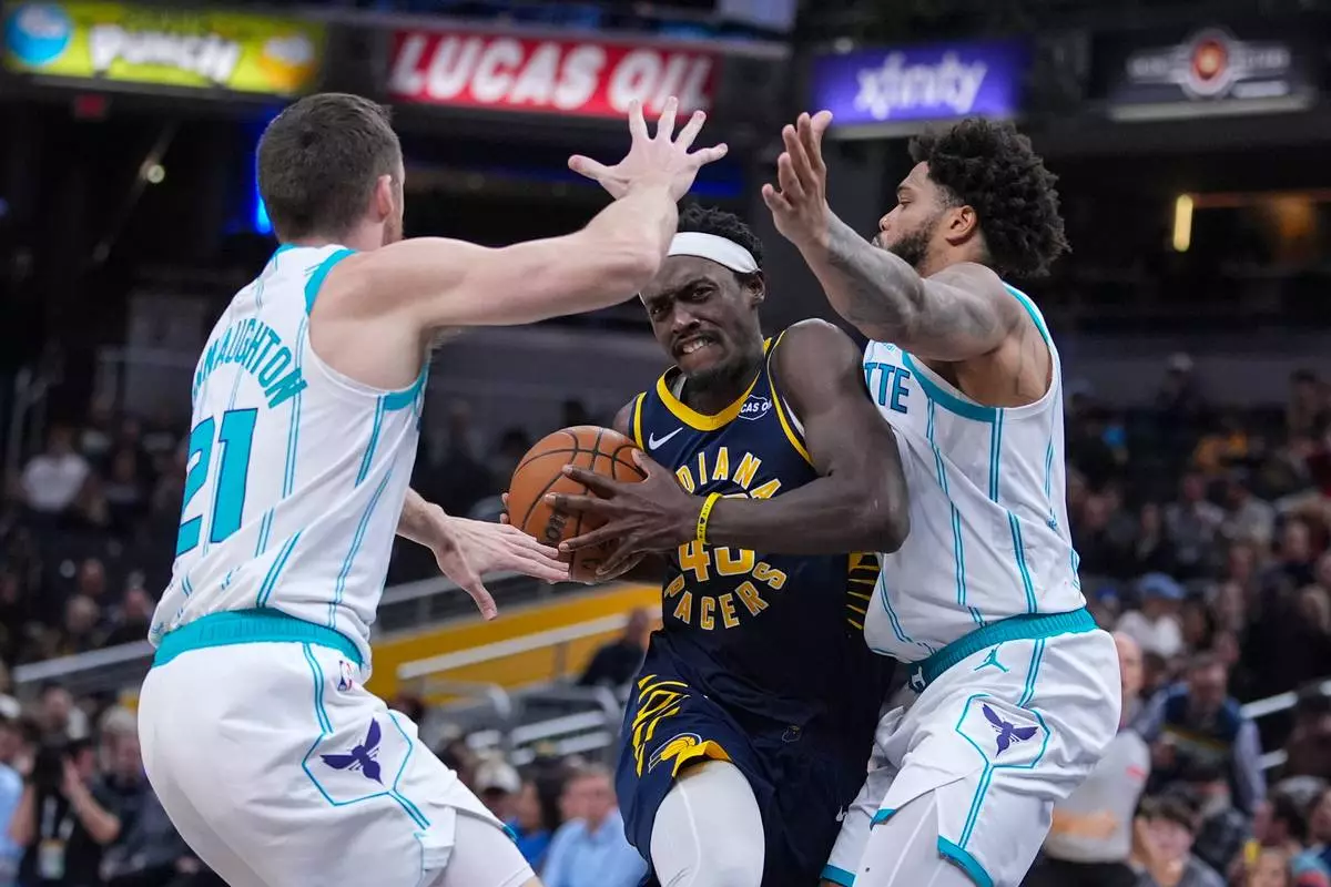 Indiana Pacers forward Pascal Siakam (43) drives between Charlotte Hornets guard Pat Connaughton (21) and forward Miles Bridges (0) during the second half of an NBA basketball game in Indianapolis, Wednesday, Nov. 19, 2025. (AP Photo/Michael Conroy)