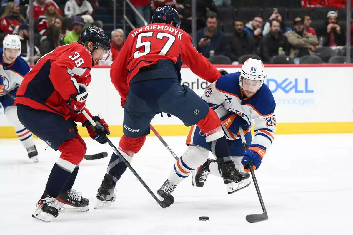 Edmonton Oilers left wing Andrew Mangiapane (88) lunges for the puck against Washington Capitals defenseman Trevor van Riemsdyk (57) and defenseman Rasmus Sandin (38) during the second period of an NHL hockey game, Wednesday, Nov. 19, 2025, in Washington. (AP Photo/Nick Wass)