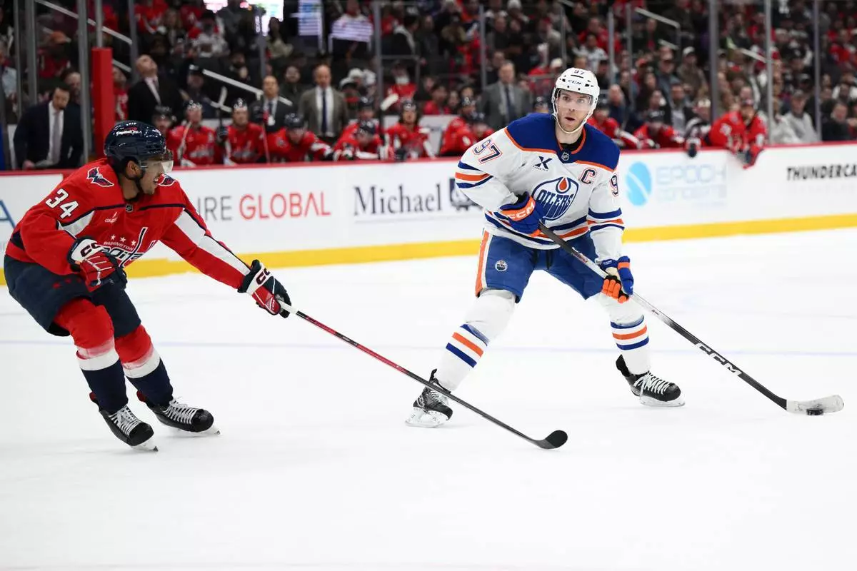 Edmonton Oilers center Connor McDavid (97) skates with the puck against Washington Capitals right wing Justin Sourdif (34) during the second period of an NHL hockey game, Wednesday, Nov. 19, 2025, in Washington. (AP Photo/Nick Wass)