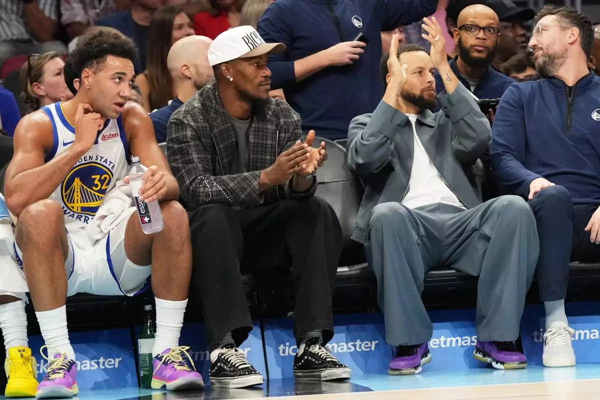 Golden State Warriors forward Jimmy Butler III, second from second, and guard Stephen Curry, second from right, applaud during the first half of an NBA basketball game against the Miami Heat, Wednesday, Nov. 19, 2025, in Miami. (AP Photo/Lynne Sladky)