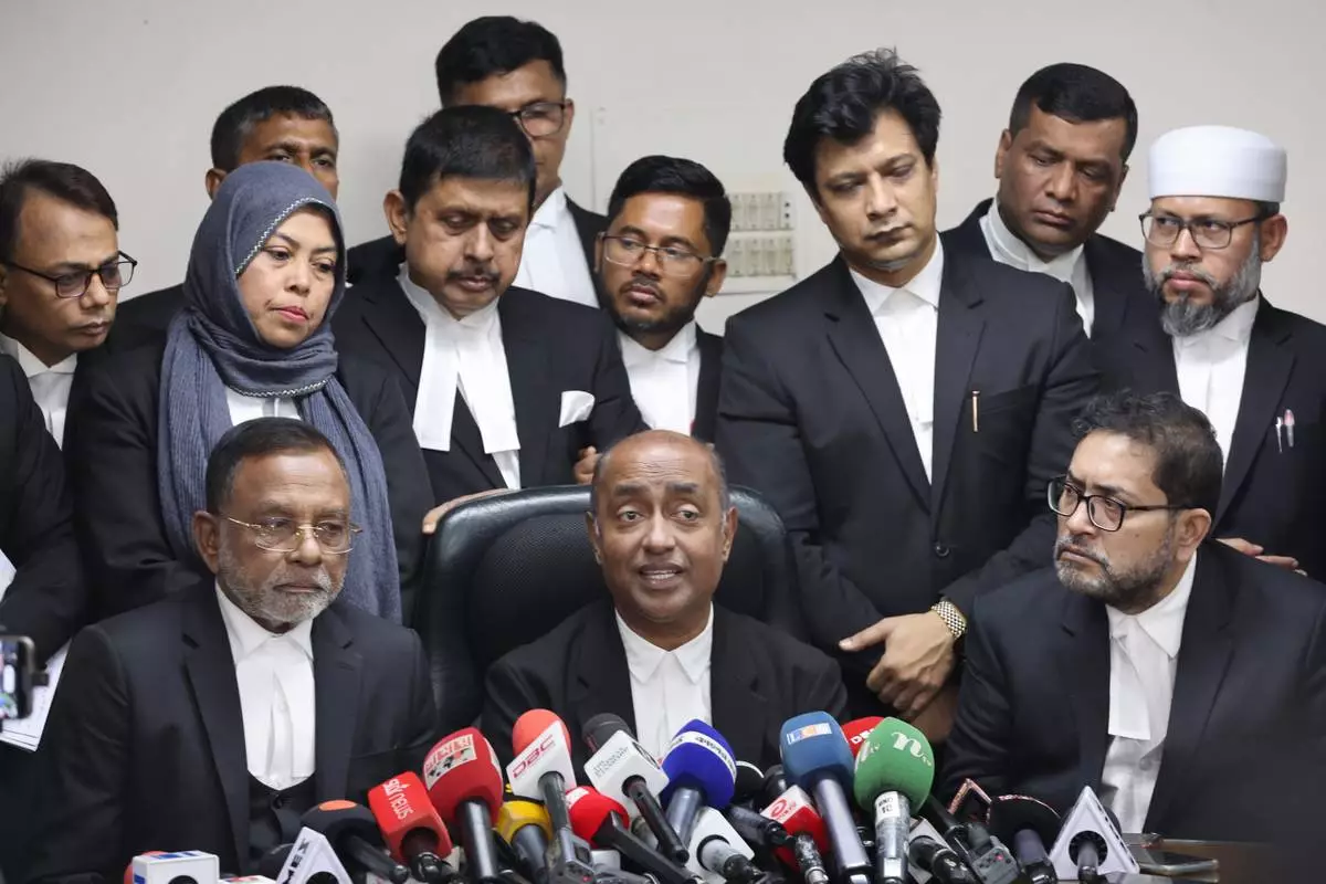 Bangladesh Attorney General Md Asaduzzaman, center sitting, and senior lawyers address a press conference after Supreme Court restored a nonpartisan caretaker government system for national elections but said it won't apply to the polls being held early next year, in Dhaka, Bangladesh, Thursday, Nov. 20, 2025. (AP Photo/Abdul Goni)