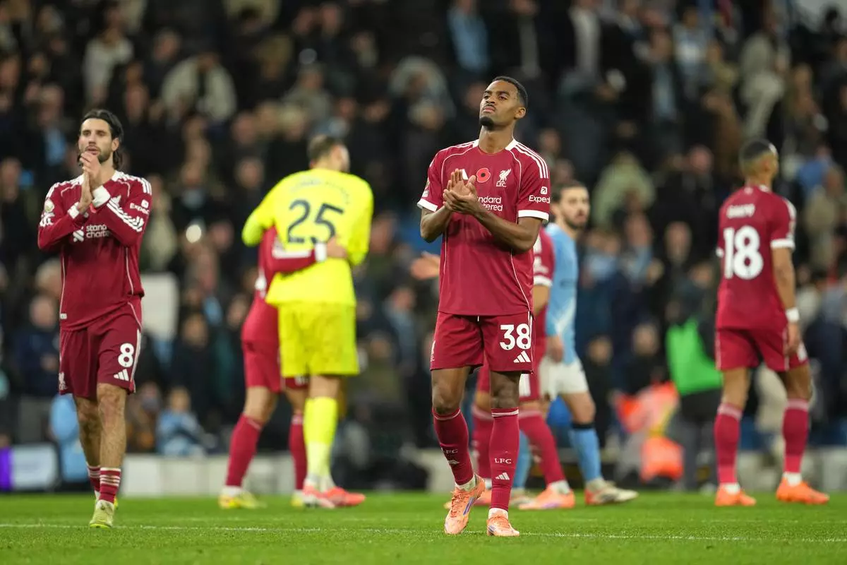 Liverpool players react disappointed after the English Premier League soccer match between Manchester City and Liverpool in Manchester, England, Sunday, Nov. 9, 2025. (AP Photo/Jon Super)