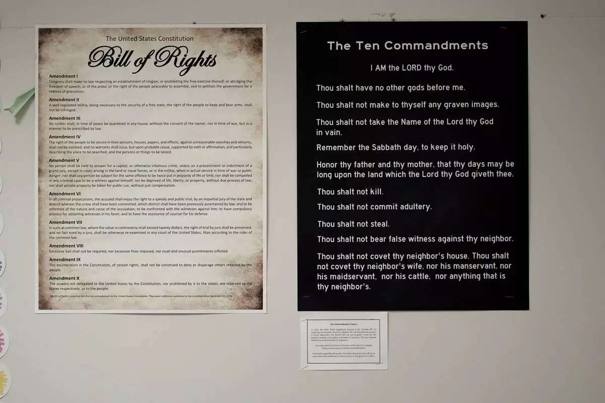 Ten Commandments and Bill of Rights posters are displayed in a classroom at Lehman High School, in Kyle, Texas, Thursday, Oct. 16, 2025. (AP Photo/Eric Gay)