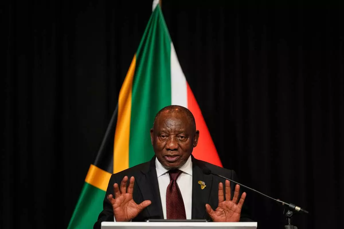 South African President Cyril Ramaphosa address the media with EU leaders in Johannesburg, South Africa, Thursday, Nov. 20, 2025. (AP Photo/Themba Hadebe)