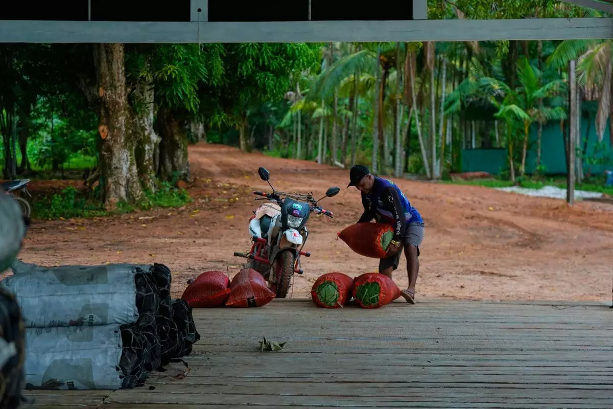 A man places sacks with acai at the port tarmac in Itacoa Miri, Brazil, Tuesday, Nov. 18, 2025. (AP Photo/Fernando Llano)