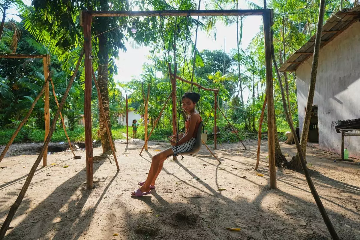 A girl plays in a park in Itacoa Miri, Brazil, Tuesday, Nov. 18, 2025. (AP Photo/Fernando Llano)