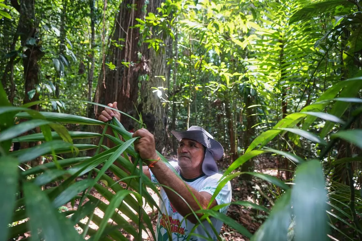 Edson Coelho broke a palm leaf to show as he makes a tool to be use to climb an acai tree at a quilombola, an Afro-descendant community called Menino Jesus in Acara, Brazil, Tuesday, Nov. 18, 2025. (AP Photo/Fernando Llano)