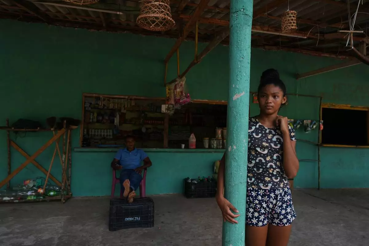 A girl stands next to her father in a grocery shop in Itacoa Miri, Brazil, Tuesday, Nov. 18, 2025. (AP Photo/Fernando Llano)