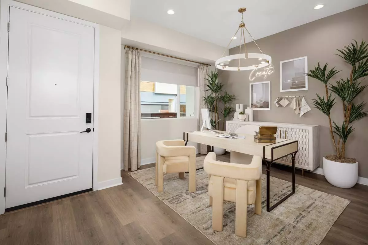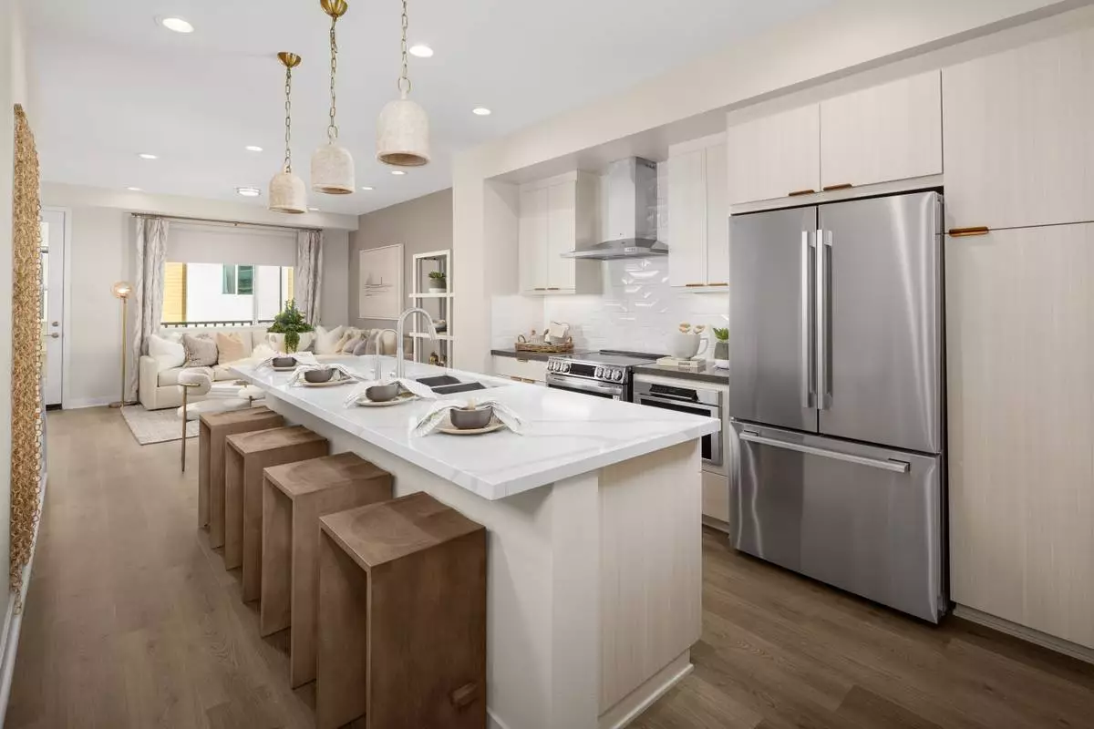 At Eginhouse, the three bright, spacious floorplans range from approximately 1,342 to 1,899 square feet with three bedrooms and up to three-and-a-half baths. Additional spaces include designated in-home live/work space, plus dens and home offices. Smart technologies—like owned solar panels, learning thermostats, water-saving fixtures, dual-glazed windows, and all-electric appliances—are built into every home, helping reduce energy, lower costs, and enhance everyday comfort. Thoughtfully designed kitchens prioritize style and functionality with popular finishes like quartz or granite countertops, flat-panel cabinets with soft-closing drawers and doors, LG stainless-steel appliances, and water filtration systems conveniently located at the kitchen sink. Attached two-car garages are standard, along with keyless entry.