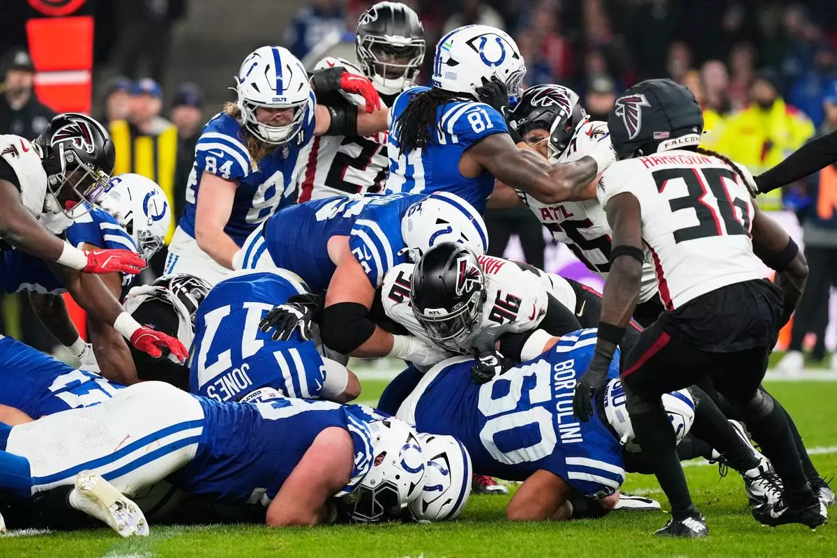 Indianapolis Colts defense stops Atlanta Falcons defensive end Zach Harrison (96) during an NFL football game, Sunday, Nov. 9, 2025, in Berlin, Germany. (AP Photo/Martin Meissner)