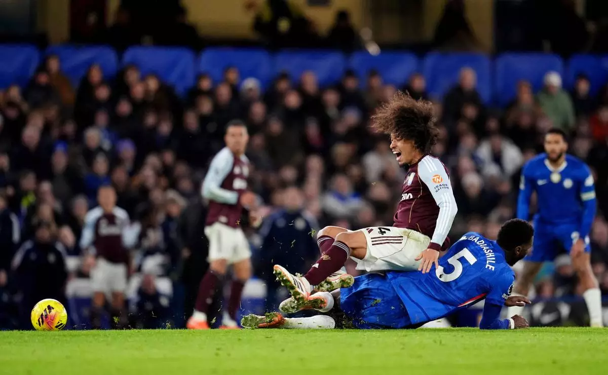 Chelsea's Benoit Badiashile, bottom, tackles Aston Villa's Boubacar Kamara, during the English Premier League soccer match between Chelsea and Aston Villa, at Stamford Bridge, in London, Saturday, Dec. 27, 2025. (Adam Davy/PA via AP)