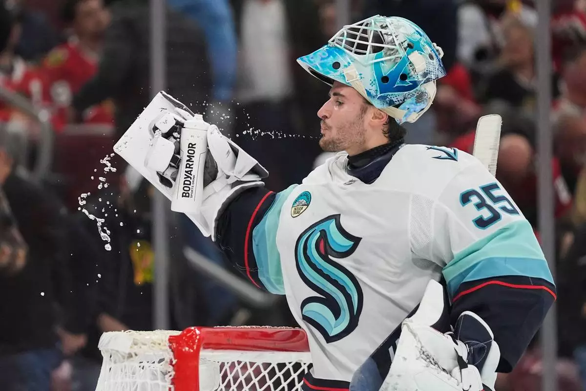 Seattle Kraken goaltender Joey Daccord (35) spits water during the second period of an NHL hockey game against the Chicago Blackhawks, Thursday, Nov. 20, 2025, in Chicago. (AP Photo/Erin Hooley)