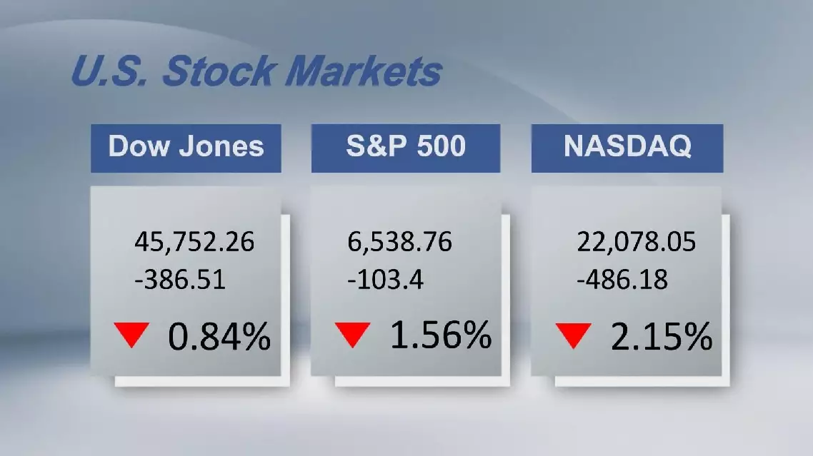 The Dow Jones Industrial Average fell 386.51 points, or 0.84 percent, to 45,752.26. The S and P 500 sank 103.4 points, or 1.56 percent, to 6,538.76. The Nasdaq Composite Index shed 486.18 points, or 2.15 percent, to close at 22,078.05.