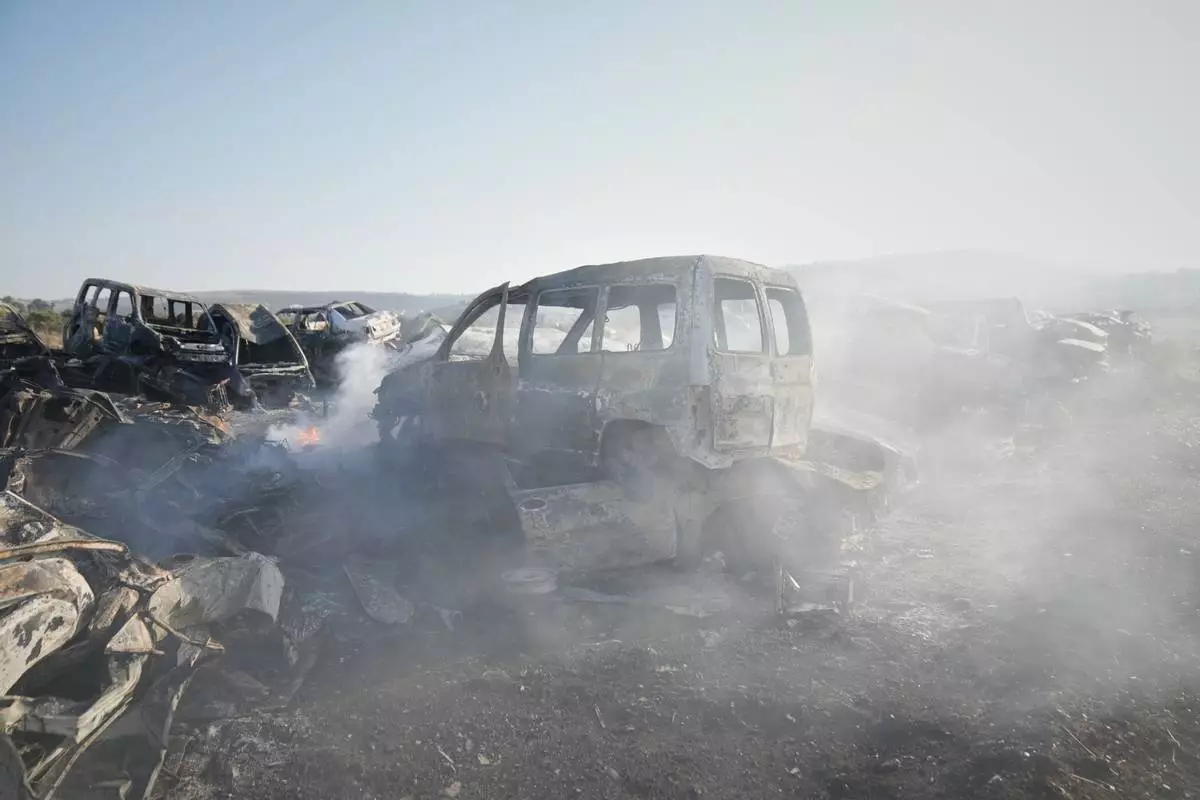 Smoke rises from scorched cars in a scrapyard that was set ablaze the night before by who local residents alleged were Israeli settlers in the town of Huwara near the West Bank city of Nablus, Friday, Nov. 21, 2025. (AP Photo/Nasser Nasser)